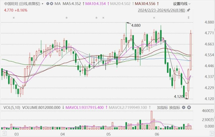 继昨日逆势收涨5.5%后,中国旺旺(0151.HK)今日再度走高,盘中一度涨近9%报4.8港元,股价创6月6日以来新高。