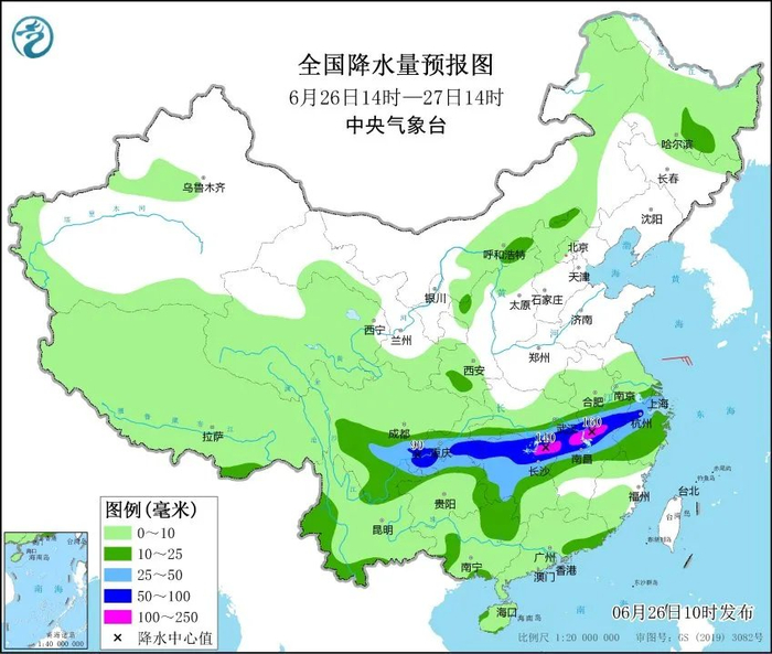 预计26日14时至27日14时,安徽南部、浙江西部和北部、上海南部、江西北部、湖北南部、湖南西部和北部、重庆南部、四川盆地南部、贵州北部等地部分地区有大到暴雨,其中,湖南东北部、江西北部、安徽西南部等地部分地区有大暴雨(100~160毫米)。上述部分地区伴有短时强降水(最大小时降雨量30~50毫米,局地可超过60毫米),局地有雷暴大风等强对流天气。