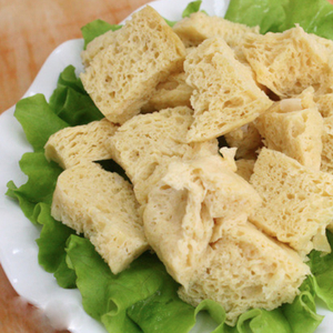 又或者将生面筋揪成小块油炸成的油面筋,外皮金黄松脆、内里疏松绵软,既可以做南方的油面筋塞肉,也可以做北方素包子的馅料,或者“黄焖两样”里的“一样”(另一样是牛肉)。