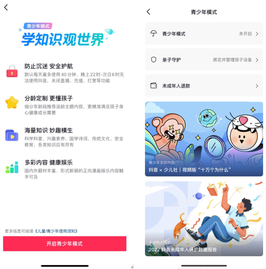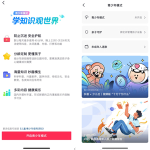 “以青少年模式使用抖音,是护航未成年人最为有效的方式。” 该工作人员表示,抖音对青少年模式有明显提醒和便捷入口,且每日出现弹窗提示开启青少年模式。当用户开启青少年模式后,将无法开播、看播、连麦,也无法充值、打赏消费和提现,并有“抖音开学季”“向上!中国少年”“天宫课堂”“少年科学说”等知识回放,为青少年提供优质、专业、适龄的内容。