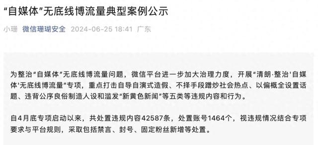 6月25日,微信珊瑚安全微信公众号发布《“自媒体”无底线博流量典型案例公示》,全文如下: