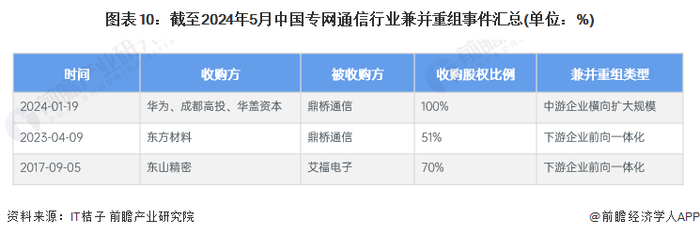 目前中国专网通信行业的兼并重组事件数量较少,截至2024年5月,仅3起收购事件,兼并重组类型以下游企业前向一体化。