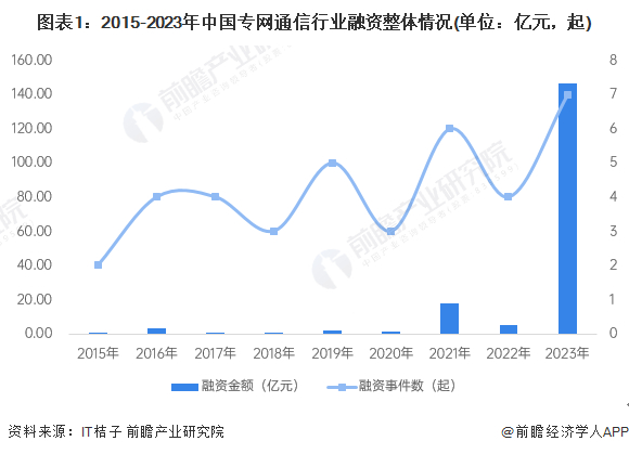 2015年以来,专网通信行业融资事件数量相对较少,每年融资事件数量基本在10起以下。其中,2023年融资规模达到最大规模,融资总额为146.55亿元,融资事件数量为7起。