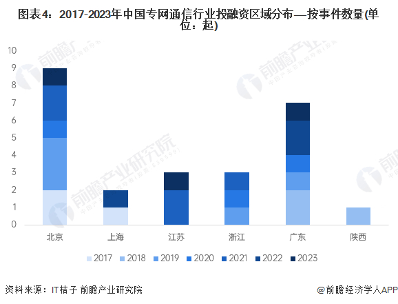 从专网通信行业的企业融资区域来看,北京市和广东省企业融资数量最多,2017-2023年累计分别为7起和9起;其次是江苏省和浙江省,2017-2023年累计融资事件数量均有3起。