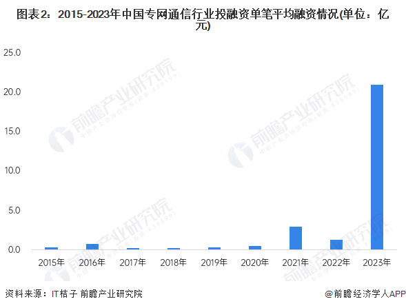 2015-2023年我国专网通信行业单笔平均融资金额整体呈波动趋势。其中2023年单笔平均融资金额最高达到20.9亿元,其余年份单笔平均融资金额较小。