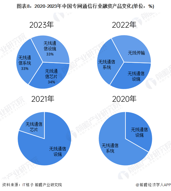 从2020-2023年融资企业的主营产品分析,无线通信系统和无线通信设施领域一直是专网通信行业的投资热点。2023年无线通信系统领域和无线通信设施领域投资事件占总投资事件的比重均在33%左右。