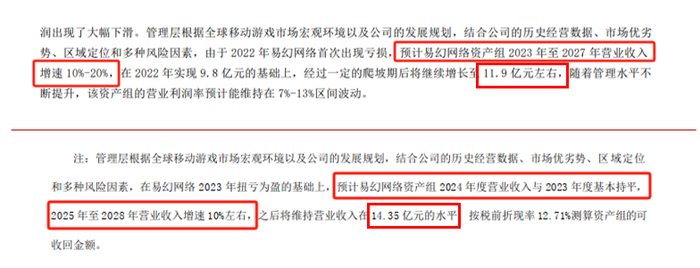 而截至2023年底,发行人商誉账面价值仍有高达74,395.46万元,占报告期末公司净资产的19.05%,占发行人全年净利润的比例更是高达670.24%。而从年报所披露商誉减值测试情况来看,易幻网络的实际经营情况仍然与测试预期有着较大的差距。2022年,发行人对于易幻网络商誉减值测试的关键假设参数为:预计其资产组2023年至2027年营业收入增速为10%-20%,而年报所披露子公司2023年实际营收同比增速仅为2.26%。
