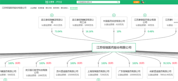 企查猫股权穿透图显示,恒瑞医药投资了34家公司,其中有28家是存续或在业状态,分别是江苏原创药物研发有限公司、成都盛迪医药有限公司、上海恒瑞医药有限公司等。