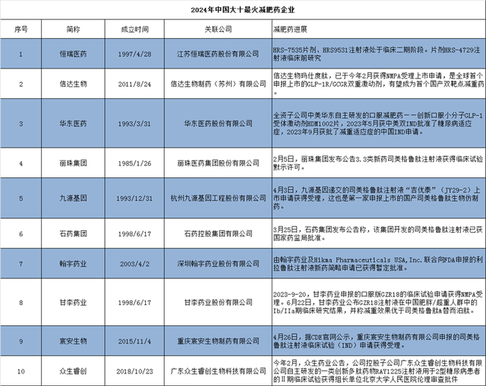 以下是2024年中国大十最火减肥药企业一览(排名不分前后)