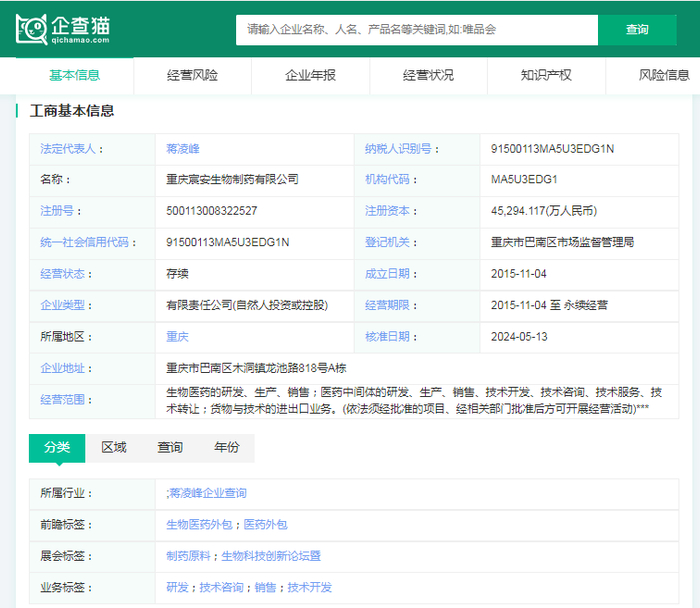企查猫资料显示,重庆宸安生物制药有限公司成立于2015年,位于重庆市国际生物城,是一家专注于糖尿病治疗性药物研发和生产的高技术企业。该公司也是重庆本土集研发、临床研究与生产为一体的生物制药高科技企业。2023年,11月23日晚间,智飞生物发布公告称,拟以现金形式收购宸安生物公司100%股权。