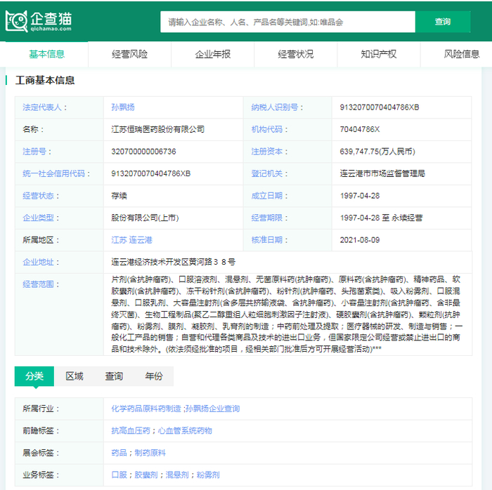 企查猫资料显示,江苏恒瑞医药股份有限公司(简称:恒瑞医药)成立于1997年,注册资金为639,747.75(万人民币),法人代表是孙飘扬。该公司是中国500强之一,专注于高品质药物的研发、生产及推广,业务领域覆盖抗肿瘤、手术用药、自身免疫疾病、代谢性疾病、心血管疾病等多个方面。