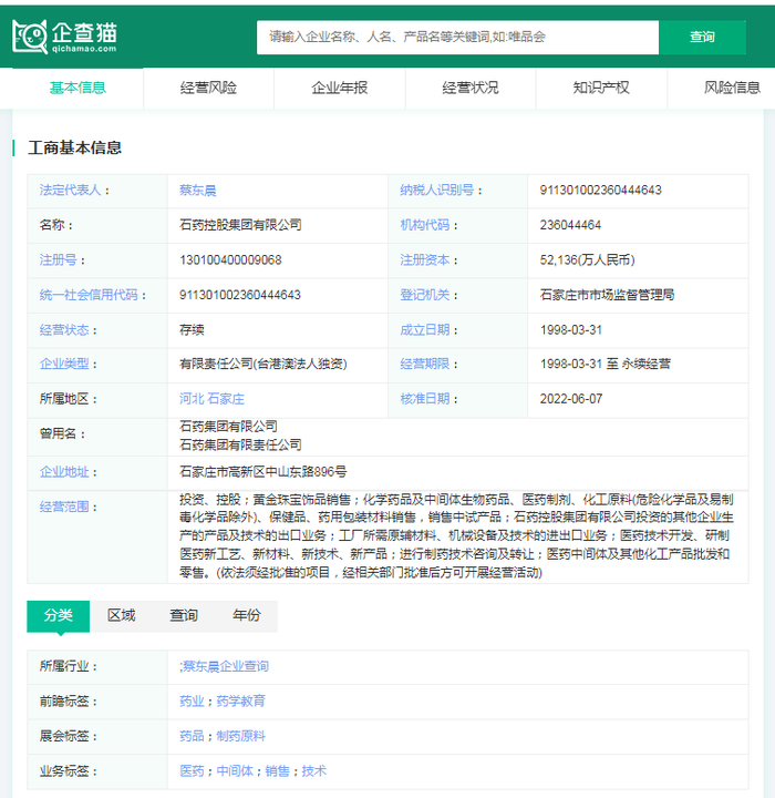 石药控股集团有限公司(简称为石药集团)成立于1998年,注册资金为52,136(万人民币)。作为一家国家级创新型企业,石药集团致力于创新药物的研发、生产和销售。该公司是中国500强之一,拥有国内外一体化的研发体系和10余个药品生产基地。其产品销售网络遍及全球100多个国家和地区。
