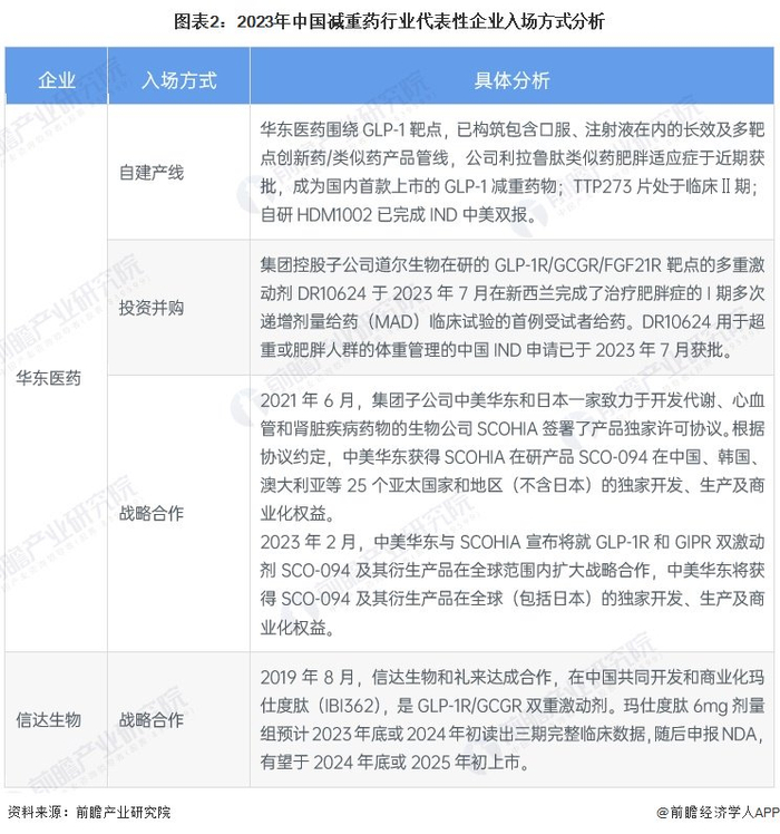 我国减重药行业代表性企业入场方式主要有自建生产线、投资并购和战略合作三种方式。华东医药围绕GLP-1靶点,已构筑包含口服、注射液在内的长效及多靶点创新药/类似药产品管线,公司利拉鲁肽类似药肥胖适应症于近期获批,成为国内首款上市的GLP-1减重药物;集团控股子公司道尔生物在研的GLP-1R/GCGR/FGF21R靶点的多重激动剂DR10624用于超重或肥胖人群的体重管理的中国IND申请已于2023年7月获批;子公司中美华东与SCOHIA宣布将就GLP-1R和GIPR双激动剂SCO-094及其衍生产品在全球范围内扩大战略合作,中美华东将获得SCO-094及其衍生产品在全球(包括日本)的独家开发、生产及商业化权益。