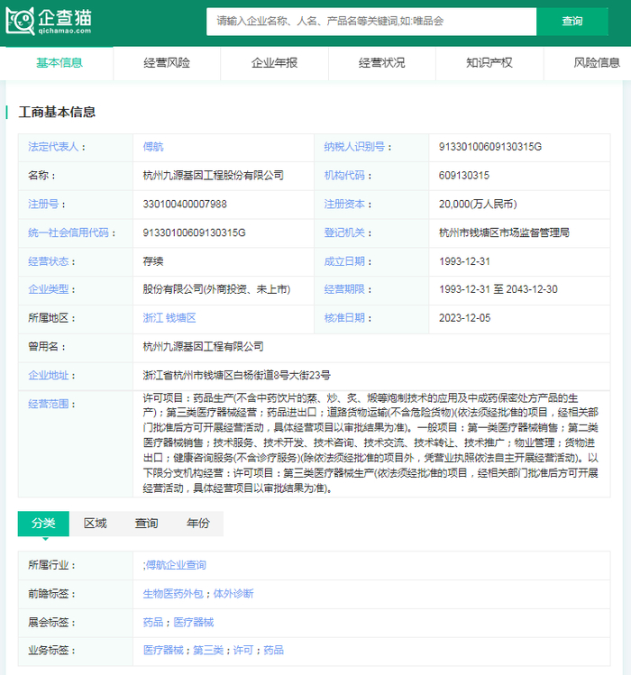 根据企查猫的资料显示,杭州九源基因工程股份有限公司(简称:九源基因)成立于1993年,注册资金为20,000(万人民币),法人代表为傅航,公司地址位于浙江省杭州市。九源基因是一家专注于基因工程药品、生化药品以及医疗器械研发、生产和销售的现代生物制药企业。作为浙江省甚至全国最早成立的基因工程制药企业之一,该公司于1996年10月在国内率先研制成功升白细胞特效药—吉粒芬(rhG-CSF),并实现了产业化,打破了美日厂家对市场的垄断局面。