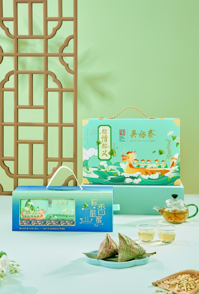 今年端午,吴裕泰新推出“粽香甜蜜”和“粽情粽意”两款茶粽礼盒,采用青绿色为主色调,清新淡雅。包装设计融入赛龙舟、粽子等端午节经典元素,同时加入茉莉花、茶叶元素,突显茶粽子的特点。
