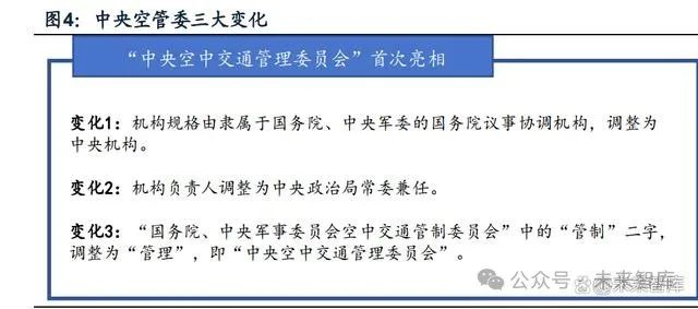 具体来看,组织架构方面,中央空管委首次亮相。据民用航空网,2021年4月,中央 空中交通管理委员会首次亮相,此前,我国空管工作的最高领导机构为国务院、中 央军事委员会空中交通管制委员会(简称国家空管委)。此次名称的变更,实际上是 将原先属于国务院议事协调机构调整为中央机构。与国务院、中央军委空中交通管 制委员会相比,新亮相的中央空中交通管理委员会发生鲜明变化:(1)机构规格由 隶属于国务院、中央军委的国务院议事协调机构,调整为中央机构;(2)机构负责 人调整为中央政治局常委兼任;(3)“国务院、中央军事委员会空中交通管制委员 会”中的“管制”二字,调整为“管理”,即“中央空中交通管理委员会”。本次 变更是由虚向实的重大转变,也就是说作为中央机构,中央空管委将进入实际性运 作,空中交通管理进入加速阶段。