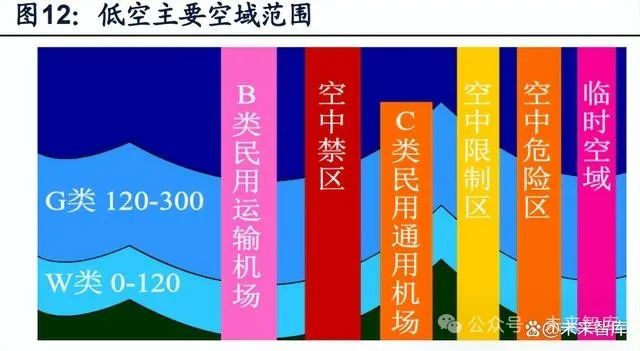 传统民航空域范围广、干扰少,无人机空域高度低、需避让空间多。《中华人民共 和国空域管理条例(征求意见稿)》按照空域等级方式将中国空域分为两级七类,包 括管制空域(A、B、C、D、E类)和非管制空域(G、W类)。传统民航空域主要 包括A、B、C、E类空域,A类空域通常为标准气压高度6000米(含)以上至标准气 压高度20000米(含)的空间;B类空域通常划设在民用运输机场上空;C类空域通 常划设在建有塔台的民用通用机场上空;E类空域是除A、B、C、G、W类空域外的 空间,可以根据运行和安全需求选择划设。无人机空域用户主要涉及非管制空域G、 W类,G类空域真高120-300米,多用于eVTOL、物流、巡检等行业类无人机飞行; W类空域真高120米以下主要用于轻型无人机的飞行。此外还需要避开B、C类民航 空域及其他存在军事活动或重要应用的空中禁区、危险区、限制区、临时空域等。通 过让不同类型无人驾驶航空器按照不同高度层运行来保障安全,同时尽可能提高空 域使用的自由度。