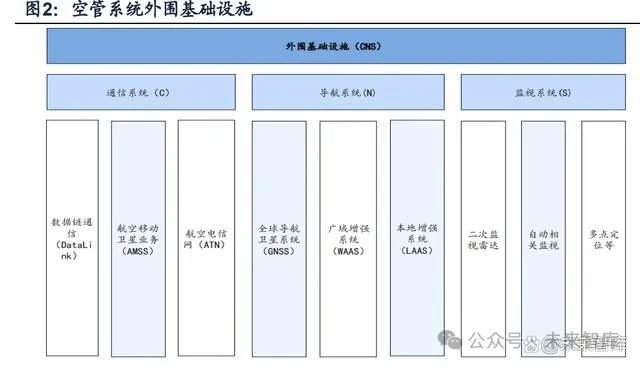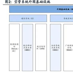 外围设施方面,空管系统外围设施以通信系统、导航系统、监视系统三部分为核心, 配套相关数据处理系统。据《现代空中交通管理》(张军,北京航空航天大学出版 社,2005年),通信系统负责飞机与地面的通信,导航系统用于飞行路径规划和引 导,而监视系统则监测和跟踪飞行器的位置和状态。这些系统相互配合,共同构成 了现代化的空中交通管理体系。