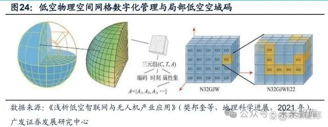 底层技术架构方面,空域数字化、网格化为空域资源的精细化管理和资源的优化配置提供可能。据《浅析低空智联网与无人机产业应用》(樊邦奎等,地理科学进展, 2021年),低空数字化工程就是以空间信息剖分组织理论与技术为基础,将低空空 域物理空间剖分成各种尺度的连续网格或网格体,引接与汇聚每个网格空间的属性 数据,包括气象、雷达、地理地物特性及管理属性,为低空空域管控提供基础数据支 撑;实现了飞行实体空间到计算虚拟空间的映射,使无人机在空中的各种运行和管 理都能在计算虚拟空间建模重构。数字网格空域为大规模对象的协同控制提供了可 能性;构建基于网格的交通流量管理方法,为空域的精细控制提供先决条件。未来, 将基于全球统一时空格网模型实时动态的进行航空器航迹监测和管理; 利用时空网 格计算与分析技术实现对航路高度层资源的安全、精准利用,提高航路容量, 促进 空域资源的合理调度和高效利用;直观精准的判别各航空器之间在高度层、水平层 之间的空间关系,实现飞行安全预警,包括偏航监测、飞行冲突探测等工作,提高空 管安全运维效率,保障航空器的飞行安全。