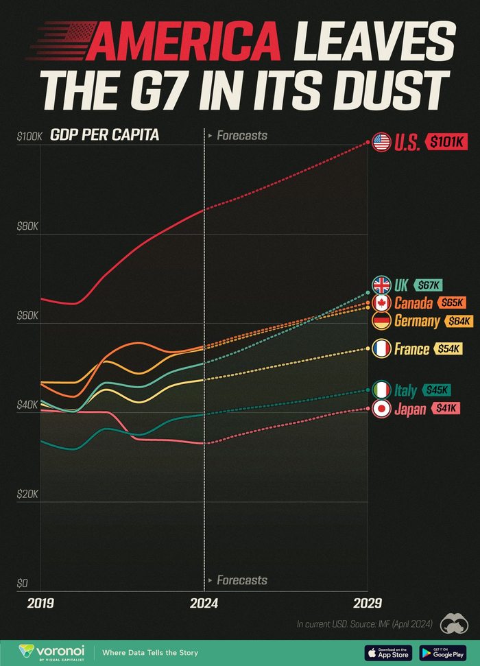 格隆汇6月26日|根据国际货币基金组织(IMF)截至2024年4月的数据,下图展示了G7国家从2019年至2029年的人均GDP(预测值)对比走势。
