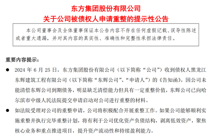 6月25日晚间,东方集团股份有限公司(下称“东方集团”)(600811.SH)发布公告称,因未能清偿东辉公司到期债务,明显缺乏清偿能力但具有一定重整价值,已被债权人黑龙江东辉建筑工程有限公司向哈尔滨市中级人民法院申请重整。东方集团将积极支持配合重整相关工作,尽快推动、化解公司存量债务风险,保护债权人和投资人的合法权益。