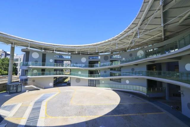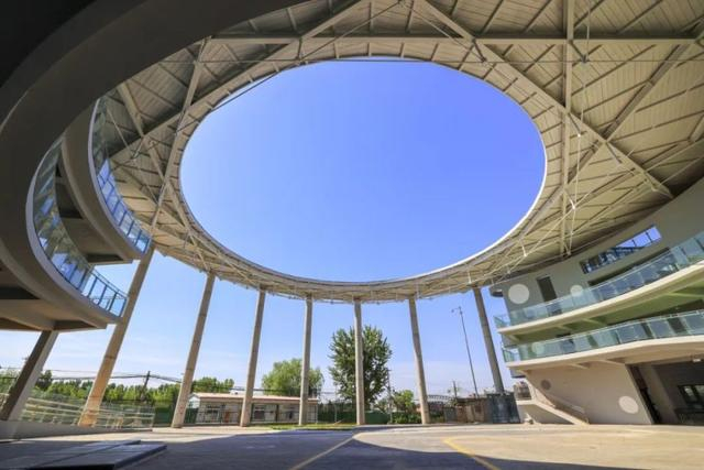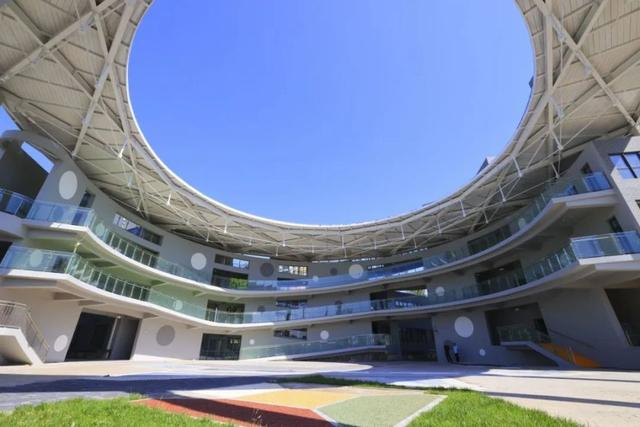 走进校门,一个巨大的“圆环形”建筑格外引人注目。七根象征着力量与稳定、秩序与规则、高贵与优雅、传承与延续的巨大的担当立柱支撑起了一个三层楼高的“半开放式”圆形屋顶。透过钢结构的顶棚中间巨大的椭圆形,同学们可仰望澄澈高远的天空,看云卷云舒……更有明媚的阳光穿过屋顶直接洒落到学校,洒落到五色沃土,洒落到孩子们和老师们的身上,整个区域既明亮又清爽。