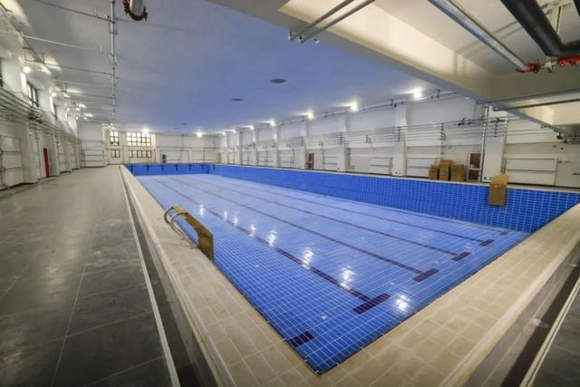 游泳馆面积750平米,泳池已铺好深蓝色瓷砖,可设置6个泳道。