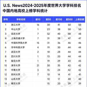 U.S. News 2024-2025年度世界大学学科排名中国内地高校上榜学科数统计如下: