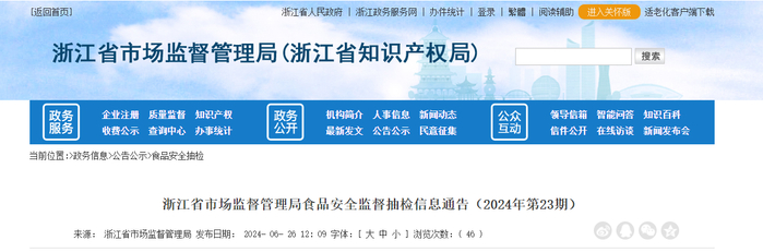 浙江省市场监督管理局食品安全监督抽检信息通告(2024年第23期)