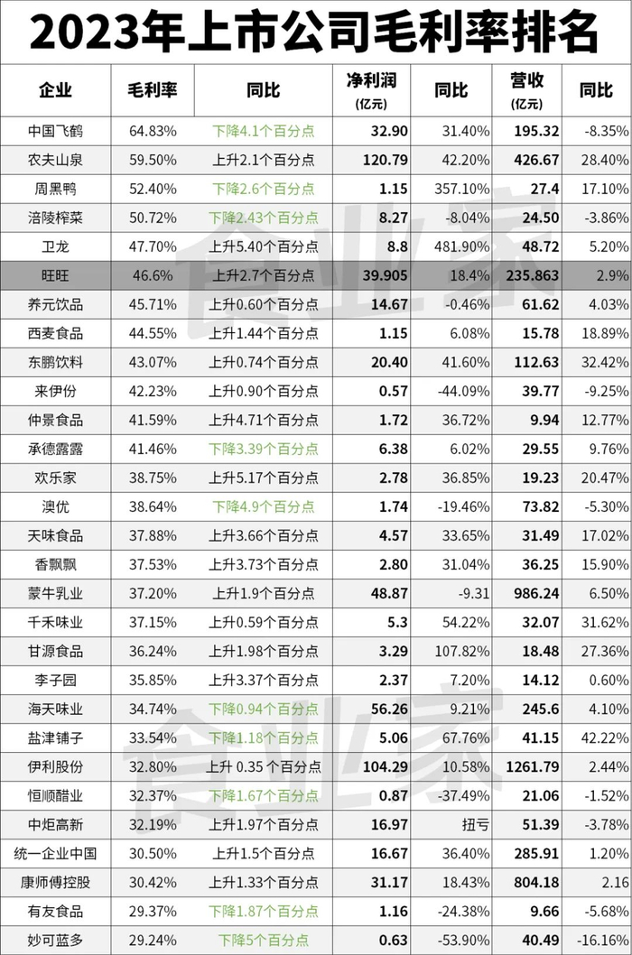 在大食品行业,中国旺旺的毛利率也是处于第一梯队的。2023财年,中国旺旺毛利率较去年同期上升2.7个百分点达到46.6%。