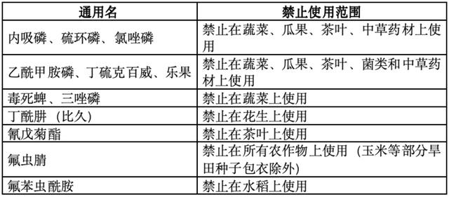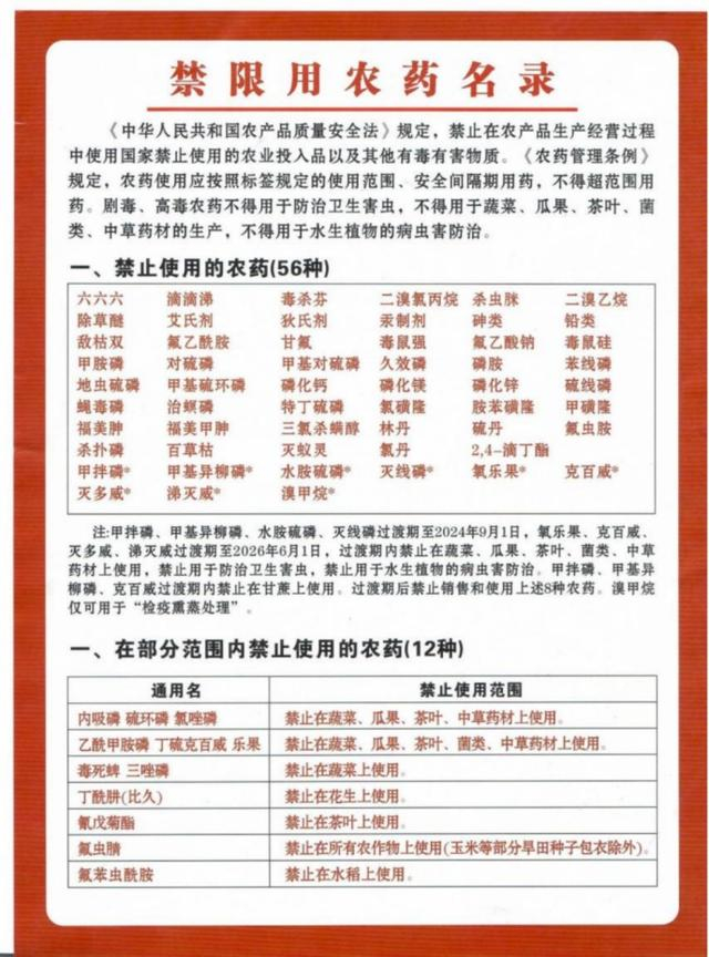 注:甲拌磷、甲基异柳磷、水胺硫磷、灭线磷过渡期至2024年9月1日,过渡期内禁止在蔬菜、瓜果、茶叶、菌类、中草药材上使用,禁止用于防治卫生害虫,禁止用于水生植物的病虫害防治。甲拌磷、甲基异柳磷过渡期内禁止在甘蔗上使用。过渡期后禁止销售和使用上述5种农药。氧乐果、克百威、灭多威、涕灭威过渡期至2026年6月1日,过渡期内禁止在蔬菜、瓜果、茶叶、菌类、中草药材上使用,禁止用于防治卫生害虫,禁止用于水生植物的病虫害防治。克百威过渡期内禁止在甘蔗上使用。过渡期后禁止销售和使用上述4种农药。溴甲烷仅可用于“检疫熏蒸处理”。
