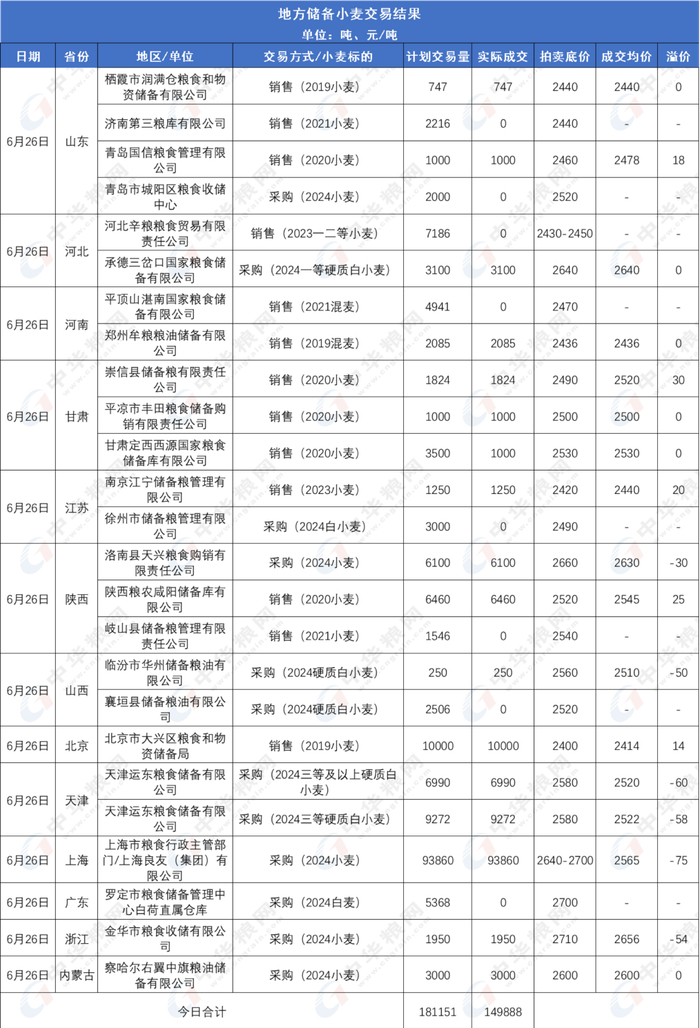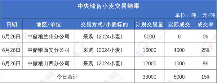 6月26日中央储备小麦和地方储备小麦成交结果: