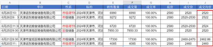 6月26日天津运东粮食储备有限公司竞价采购2024年小麦6990吨,全部成交,底价1.29元/斤,成交价1.26元/斤,较上周上涨3分左右。