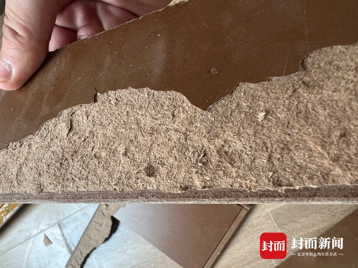 在收房过程中,有细心的业主撬开木地板查验,发现地板内部像纸片一样,看起来质量不好。