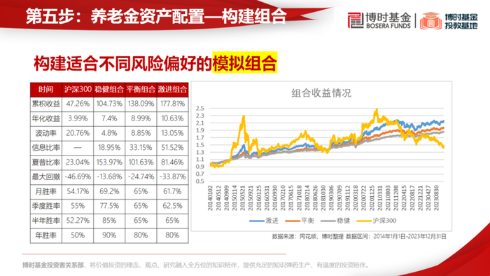 第三,投资组合的资产配置,简单说就是养老投资如何在股票、债券、实物资产、保险等不同的大类资产之间分配权重,将同时决定组合风险水平和收益水平,如果组合的预期收益过低,也会影响养老金的长期累计效率。所以制定投资组合方案既需要照顾投资者的风险偏好,也需要兼顾投资收益的目标甚至投资金额的约束。对于风险承受能力高且投资收益要求也更高的投资人,组合中需要适当增加权益类资产的配置。而对于风险偏好低且对收益要求不高的投资人,固定收益资产的就应该是整个组合的大头,权益类资产应该配置很低或者不配。