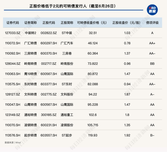 据记者统计,截至6月26日收盘,“破净”可转债中仍有数家非金融企业资产负债率在70%以上。