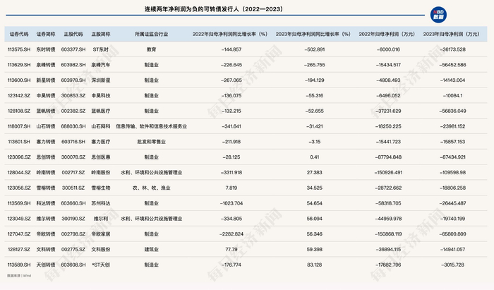 记者还注意到,有15家面值低于100元可转债的正股公司连续两年归母净利润亏损。