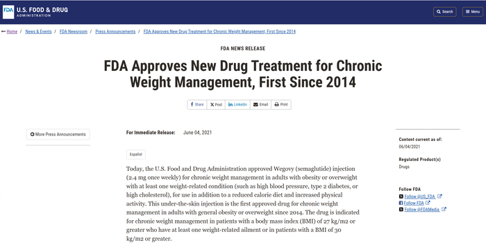 2021年6月,司美格鲁肽肥胖适应症在美国获批