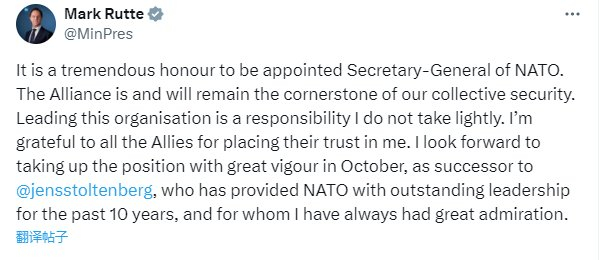 吕特周三在社交媒体上发文称:“被任命为北约秘书长是极大的荣幸。北约现在是、将来也将是我们集体安全的基石,领导这个组织是一项我不会草率对待的责任。”