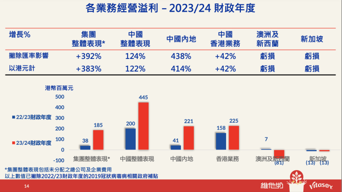 至于内地以外的其他市场,香港业务(涵盖港澳地区及出口)实现了收入与溢利双增长,经营溢利同比增长42%;澳洲及新西兰的业务正积极应对缺货等问题,单预期未来产能及稳定性将得到加强;新加坡业务的饮品销售额在转换经销商前短暂下降,继而影响整体业绩,并抵消豆腐出口的增长。