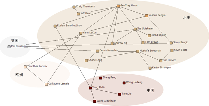 注:网络中的节点表示当前全球知名大模型所属公司或组织的首席科学家等核心技术负责人,连线表示两个节点间存在师生同事、亲缘等一种或多种关系,统计截至时间为2024年5月14日。