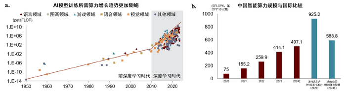 算力在AI时代承担着重要角色,但其提升依赖高性能芯片的发展,核心技术壁垒较高。进入深度学习时代后,AI算力提升的曲线相较以前更加陡峭。2010年前,训练AI的计算量每21.6个月翻一番,2010年以来,在最大的AI训练运行中所使用的计算量大约在6个月内翻倍,过去13年已增长了3.5亿倍(图表1.10a)。为了获得AI性能的整体提升,需要持续投入大量的硬件GPU。而在芯片领域,首先,芯片制造是复杂的系统工程,在设计、制造、封装测试等环节中,该领域的传统领先者积累了大量知识,形成技术壁垒;其次,美国GPU领先全球,后发国家受到一定程度的制约,追赶存在一定难度。根据IDC测算,2023年中国智能算力规模达到414.1EFLOPS,同比增长59.3%。但国际比较来看,2024年中国全国智能算力规模或低于Meta公司所拥有的H100算力(图表1.10b)。