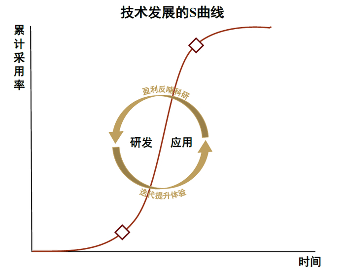 图表1.7:到达S型曲线的第一拐点后,“研发-应用”正向循环下进入技术迭代和扩散的加速期