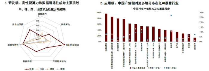 多元细分的大市场是引领AI次级创新发力的基础保障。从技术层面看,AI的通用性意味着其在与各行业融合落地应用时门槛较低,且大国往往在人才、数据、基础设施和产业链成熟度等方面有较强积累。从市场层面看,商业市场潜力大的行业更能够发挥国内的市场规模优势,加速AI的应用。在需求端,大国的市场需求多样性较强,创新场景丰富,更易匹配成熟技术的各种应用场景,这为AI技术应用带来更大的扩散空间,能更广泛地刺激AI次级创新的产生;且大国的总体市场和细分市场规模均足够大,进一步摊薄次级创新的成本,支撑AI应用的商业利润,反哺应用技术的进一步创新,形成正向循环,有望快速缩小与领先国家的差距。在供给端,市场规模较大的国家,经济复杂性指数也较高,即产品多元化程度更高,应用场景更多,这提供了更多与AI融合的机会[94]。