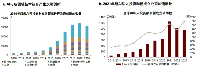 创新催生方面,本轮AI已促进各领域发生次级创新,尤其是在研发端开启了科学研究的新范式。就像蒸汽和电力等通用动力设备的嵌入推动了各类机械制造工艺的创新,AI技术也与各行业相对成熟的现有技术结合(图表1.8a),产生了自动驾驶汽车、医疗影像分析系统和个性化推荐商业软件等次级创新。不仅如此,与电力和IT技术促进创新时人类处于操控和主导地位不同,AI还可以直接参与到研发端的科学发现过程中,以相对更高的自主性和创造性与人类进行更深入的协作,通过改进搜寻和推理过程来赋能科学研究的各个阶段,从而完善了大尺度、高精度、高成本的研究范式[53],加速了各个领域的创新发现。澳大利亚学术机构CSIRO称,截至2023年,超过99%的研究领域曾发表过涉及AI的学术论文;《自然》杂志发现,各学科论文发表中与AI相关的比例加速提升,2023年在标题或摘要中提及AI或AI相关关键词的论文比例为8%,而十年前为2%[54]。各领域与AI结合的授权专利数量也从2015年前的年增量不足1万快速上升至超过3万[55]。