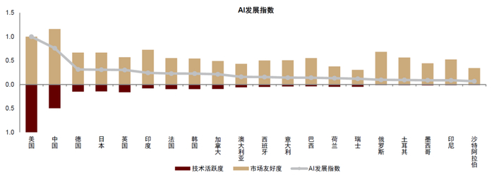 此外,智能变革将伴随着国家竞争。电力革命之前,英国作为“日不落帝国”曾享受国际领导者带来的政治经济溢价,但随着电力革命在美国的扩散,英国被美国赶超,这些溢价也随之消失。技术变革为各国打开新的竞争窗口——领先者希望在技术变革中维持领先地位,后发者希望通过技术变革得以追赶,技术变革是各国竞争的重要阵地。本轮AI变革也是如此。那么,各国AI发展水平如何,谁会引领这场智能浪潮?