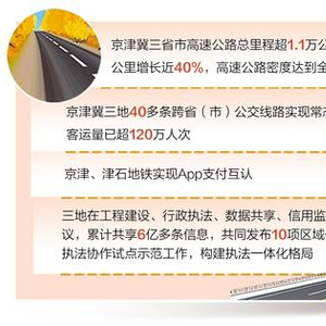 目前,京津冀三地40多条跨省(市)公交线路实现常态化运营,定制快巴累计客运量已超120万人次。京津、津石地铁实现App支付互认。三地在工程建设、行政执法、数据共享、信用监管等方面共同签署20余项协议,累计共享6亿多条信息,共同发布10项区域一体化标准,联合推进区域执法协作试点示范工作,构建执法一体化格局。