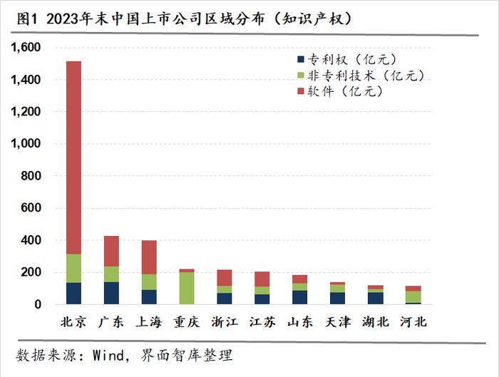 北京以1515亿元的账面价值遥遥领先,占比超过全国总量的三分之一。北京软件知识产权价值高达1201.6亿元,占据绝对优势。此外,北京在专利权(137.6亿元)和非专利技术(176.2亿元)方面也有显著积累。
