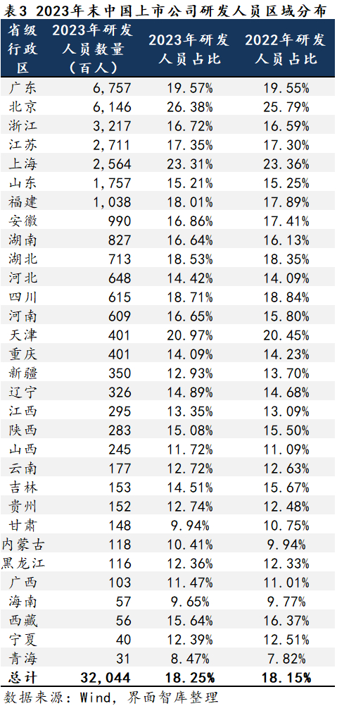 从研发人员占比的变化情况来看,部分地区的研发人员占比有所上升,如北京、广东、浙江、江苏等地的研发人员占比均较去年有所提升。然而,也有部分地区的研发人员占比出现下降,如上海、山东、安徽等地。