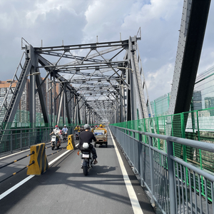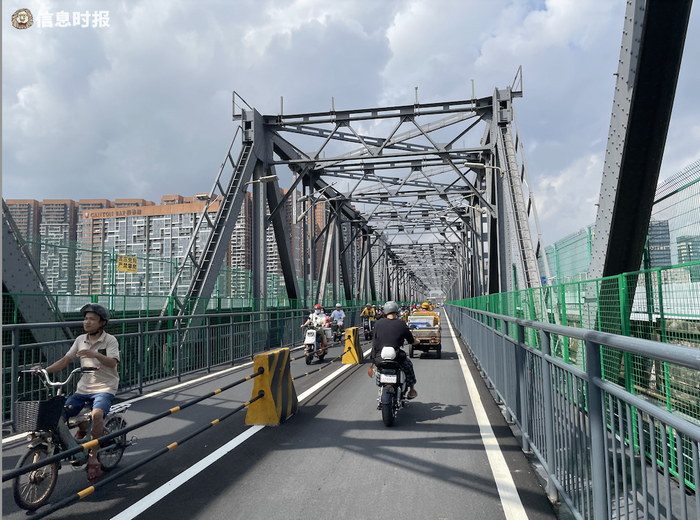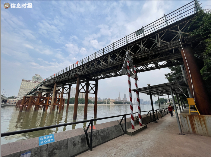 除了珠江大桥西桥有调整,珠江大桥东桥处,由于受围蔽施工影响,目前非机动车辆过江需要通过新建钢便桥进入珠江大桥东桥最内侧车道通行,经过施工区域后再重新回到原非机动车道。出于安全考虑,目前桥上已用隔离墩和围栏对旁边的机动车道进行分隔,同时,如市民想步行过江则需要借用旁边新建的临时钢栈桥,该步行桥已于今年5月开通使用。